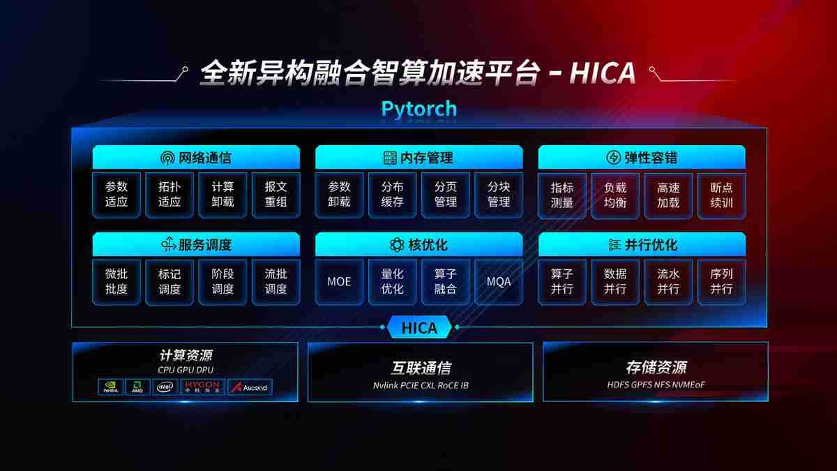 通过自研的服务层、、中间适配层、、以及调度编排算法,,采用数据并行、、、、模型并行等多种并行方式,,,把并行计算任务进行有效的分解,,,使其分别由相应的软件栈和算力资源来承接。。。。当GPU资源变化,,,HICA可以实时动态调度计算子任务并调整模型拓扑和架构,,,以充分聚合各种算力资源。。。