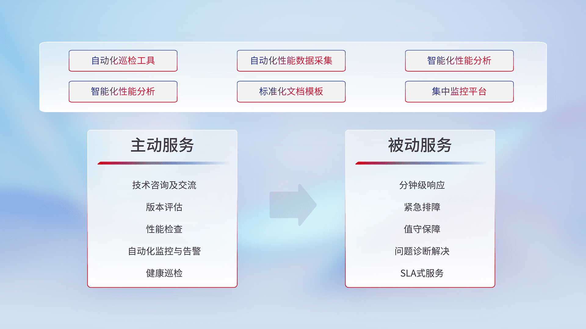 智能化工具和标准化文档,,,,保障服务质量,,提供主动服务(包含技术咨询、、版本评估、、、、性能检查、、、、自动化监控与告警、、健康巡检)和被动服务包含(分钟级响应、、、紧急排障、、、、值守保障、、、、问题诊断解决、、SLA服务)。。。