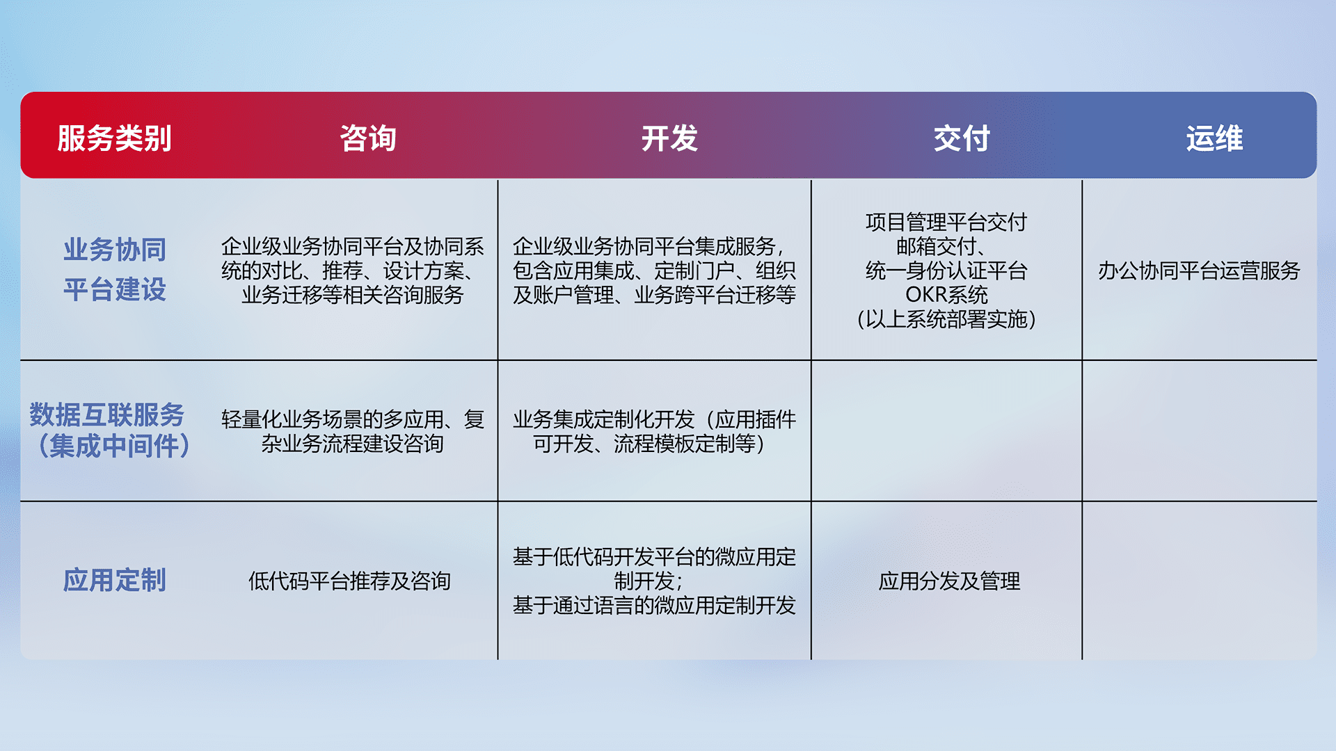 针对钉钉、、、企微、、、、IDaas等平台级产品提供产品的规划、、、、方案、、、交付、、、、定制化开发等服务,,实现如统一协同办公、、智能客户服务、、、混合会议管理、、智能数据查询、、等业务场景,,,,实现数字化转型。。。。